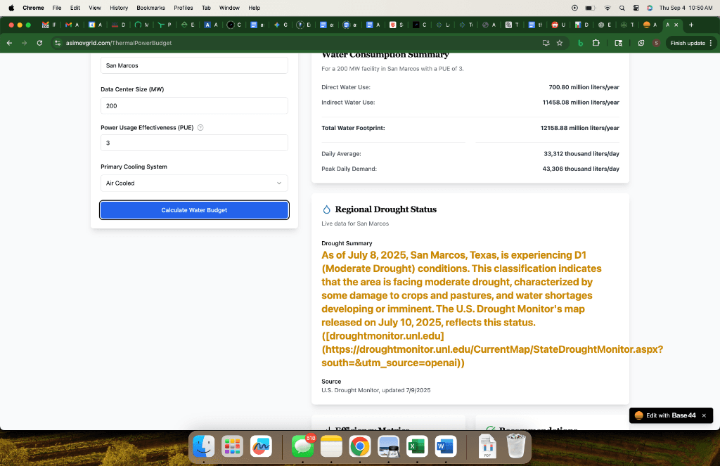 Look. I like my AI tools. A lot. Some of the data for this post came from research carried out by several of these AI tools. What I am offering is that we are scaling data center infrastructure at the expense of deep considerations for the interconnected systems that are at play here. Will there be water to cool the San Marcos data center? A calculation of the water budget (calculator tool found here) and the consequent water stress should be implemented before an application is even made. A simple run of the tool would show that the live condition of San Marcos 'is experiencing D4 (Exceptional Drought) conditions. This severe drought is characterized by significant precipitation deficits, decreased soil moisture, and low reservoir levels.'